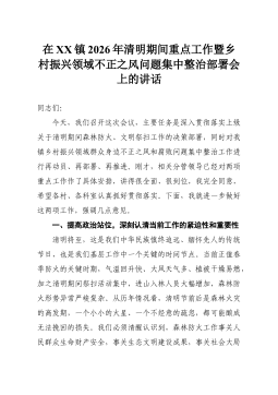 在XX镇2026年清明期间重点工作暨乡村振兴领域不正之风问题集中整治部署会上的讲话同志们:今天,我们召开这次会议,主要任务是深入贯彻落实上级关于清明期间森林防火、文明祭扫工作的决策部署,同时对我镇乡村振兴领域群众身边不正之风和腐败问题集中整治工作进行再动员、再部署、再推进。刚才,相关分管领导已经对两项重点工作作了具体安排,讲得很全面、很到位,我完全同意,希望各村、各科室认真抓好贯彻落实。下面,我就进一步做好这两项工作,强调几点意见。一、提高政治站位,深刻认清当前工作的紧迫性和重要性清明将至,这是我们中华民族慎终追远、缅怀先人的传统节日,也是我们基层工作中一个关键的时间节点。当前正值春季防火的关键时期,气温回升快、大风天气多、植被干燥易燃,加之清明期间祭扫活动集中,进山入林人员大幅增加,森林防...