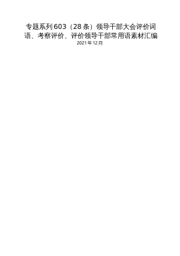 专题系列603(28条)领导干部大会评价词语、考察评价、评价领导干部常用语素材汇编2021年12月1.*同志政治坚定,敏锐性强,思路清晰,经验丰富,组织领导和驾驭全局的能力强。2.*同志政治素质好,党性观念强,工作有招法、有韧劲,敢于担当,作风硬朗。3.*同志经过多个领导岗位的历练,政治立场坚定,政治能力过硬,工作经验丰富,组织领导能力强,有强烈的进取意识和担当精神。4.*同志政治素质好,党性观念强,工作站位高。5.*同志政治素质好,经过多岗位历练,熟悉党务和经济工作,善于统筹谋划,事业心责任感强,要求自己严格。6.*同志,政治素质高、领导能力强、工作干劲足,是优秀的年轻领导干部。7.*同志勤...