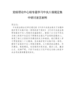 党组理论中心组专题学习中央八项规定集中研讨发言材料同志们:中央政治局会议审议通过的《中共中央政治局关于加强和维护党中央集中统一领导的若干规定》《中共中央政治局贯彻落实中央八项规定实施细则》,彰显了以习近平同志为核心的党中央坚定不移推进全面从严治党的坚强决心,体现了持之以恒抓作风建设的定力和韧劲。我们要深入学习贯彻党的二十大精神,坚决维护党中央集中统一领导,锲而不舍落实中央八项规定精神,大力推进政治建设、作风建设、制度建设,切实做到对党忠诚、服务人民、廉洁公正、纪律严明,不折不扣把以习近平同志为核心的党中央各项决策部署落到实处。第一,讲政治、立规矩,坚决做到“两个维护”。坚持和加强党中央集中统一...