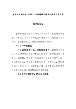 某局关于群众身边不正之风和腐败问题集中整治工作自查情况的报告根据市纪委关于群众身边不正之风和腐败问题集中整治工作要求,某局扎实开展集中整治工作,找准查实各类问题,积极整改落实。现将具体情况汇报如下:一、工作开展情况(一)强化思想认识,深化责任落实。围绕群众身边不正之风和腐败问题集中整治工作要求,坚持重遏制、强高压、长震慑,确保工作走深走实。成立工作领导小组,明确责任分工,将任务分解到各科室、各责任人,确保责任到人、任务到人,切实提高全体干部对整治工作重要性和紧迫性的认识,确保整治工作有序推进。(二)坚持多措并举,提升工作成效。牢固树立问题导向,坚持有问题抓整治、没问题抓预防,确保自查自纠不漏项...