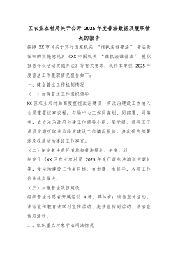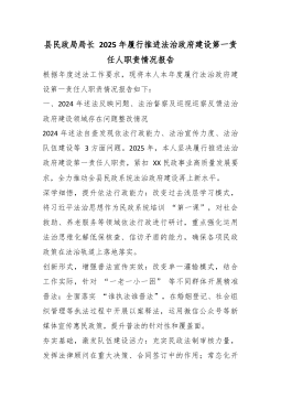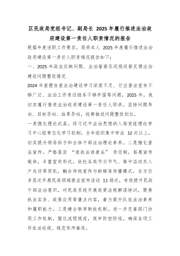 区民政局党组书记、副局长2025年履行推进法治政府建设第一责任人职责情况的报告根据年度述职工作要求,现将本人2025年度履行推进法治政府建设第一责任人职责情况报告如下:一、2025年政法反映问题、法治督察及巡视巡察反馈法治建设问题整改情况2024年查摆自查法治建设学习深度不足、行业普法宣传不够广泛、法治工作责任链条不够牢固等问题,2025年,我切实履行推进法治政府建设第一责任人职责,坚持问题导向、目标导向、结果导向,统筹推进问题整改到位。一是强化理论武装。将习近平法治思想纳入局党组理论学习中心组常态化学习机制,全年组织集中学法12次以上,切实提升领导班子和全体干部法治理论素养。二是强化普法宣传。严格落实“谁执法谁普法”责任制,拓展宣传载体,丰富宣传形式,依托各类节日节气、集中活动及入户走访等...