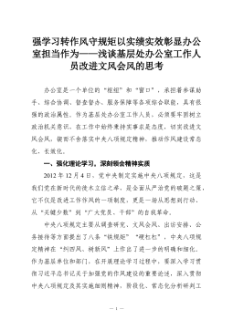 强学习转作风守规矩以实绩实效彰显办公室担当作为——浅谈基层处办公室工作人员改进文风会风的思考办公室是一个单位的“枢纽”和“窗口”,承担着参谋助手、综合协调、督查督办、服务保障等各项综合职能,具有很强的政治属性。作为基层处办公室工作人员,必须要牢固树立政治机关意识,在工作中始终秉持实事求是态度,切实改进文风会风,锲而不舍落实中央八项规定精神,推动作风建设常态化、长效化。一、强化理论学习,深刻领会精神实质2012年12月4日,党中央制定实施中央八项规定,这是我们党在新时代的徙木立信之举,是全面从严治党的破题之策,它不仅是改进工作作风的一项制度,更是一场从思想到行动、从“关键少数”到“广大党员、干部”的自我革命。中央八项规定主要从调查研究、文风会风、出访安排、公务接待等方面提出了八条“铁规矩”“硬...