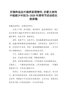 在慎终追远中涵养家国情怀,在薪火相传中砥砺少年担当-2026年清明节活动校长致辞稿尊敬的老师们,亲爱的同学们:大家上午好!草木蔓发,春和景明。值此清明将至,我们在这里举行2026年清明节主题活动启动仪式,共同追思先辈、缅怀英烈、传承文明、砥砺成长。清明,既是节气,也是节日;既承载着慎终追远的民族情感,也蕴含着厚重深沉的精神教育。对学校而言,清明节不只是一次传统节日活动,更是一堂培根铸魂的思政课,一次叩问初心的精神洗礼,一场面向未来的成长动员。今天,我想和大家谈三个关键词:追思、传承、奋进。首先,在追思中铭记来路,厚植家国情怀。清明,是回望来路的时刻。中华民族自古崇尚慎终追远、礼敬先人。一个懂得追思的民族,才是有根的民族;一代懂得感恩的少年,才是有力量的少年。同学们,今天我们所拥有的安宁校园、...