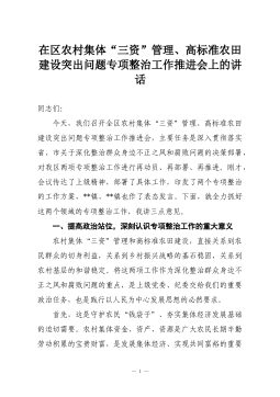 在区农村集体“三资”管理、高标准农田建设突出问题专项整治工作推进会上的讲话同志们:今天,我们召开全区农村集体“三资”管理、高标准农田建设突出问题专项整治工作推进会,主要任务是深入贯彻落实省、市关于深化整治群众身边不正之风和腐败问题的决策部署,对我区两项专项整治工作进行再动员、再部署、再推进。刚才,会议传达了上级精神,部署了具体工作,印发了两个专项整治的工作方案,**镇、**镇也作了表态发言。下面,就全力抓好这两个领域的专项整治工作,我讲三点意见。一、提高政治站位,深刻认识专项整治工作的重大意义农村集体“三资”管理和高标准农田建设,直接关系到农民群众的切身利益,关系到乡村振兴战略的基石稳固,关系到农村基层的和谐稳定。将这两项工作作为深化整治群众身边不正之风和腐败问题的重点,是上级党委、纪委交给...