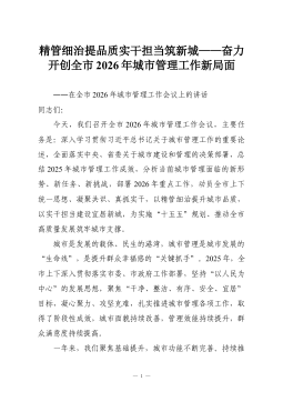 精管细治提品质实干担当筑新城——奋力开创全市2026年城市管理工作新局面——在全市2026年城市管理工作会议上的讲话同志们:今天,我们召开全市2026年城市管理工作会议,主要任务是:深入学习贯彻习近平总书记关于城市管理工作的重要论述,全面落实中央、省委关于城市建设和管理的决策部署,总结2025年城市管理工作成效,分析当前城市管理面临的新形势、新任务、新挑战,部署2026年重点工作,动员全市上下统一思想、凝聚共识、真抓实干,以精管细治提升城市品质,以实干担当建设宜居新城,为实施“十五五”规划、推动全市高质量发展筑牢城市支撑。城市是发展的载体、民生的港湾,城市管理是城市发展的“生命线”,是提升群众幸福感的“关键抓手”。2025年,全市上下深入贯彻落实市委、市政府工作部署,坚持“以人民为中心”的发...
