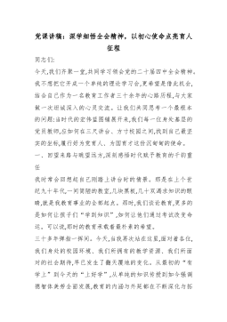 党课讲稿:深学细悟全会精神,以初心使命点亮育人征程同志们:今天,我们齐聚一堂,共同学习领会党的二十届四中全会精神。我不想把它开成一个单纯的理论学习会,更希望是借此机会,结合自己作为一名教育工作者三十余年的心路历程,与大家做一次坦诚深入的心灵交流。让我们共同思考一个最根本的问题:当时代的宏伟蓝图铺展开来,我们每一位身处基层的党员教师,应如何在三尺讲台、方寸校园之间,找到自己最坚实的坐标,履行好为党育人、为国育才这份沉甸甸的使命。一、回望来路与眺望远方,深刻感悟时代赋予教育的千钧重任我时常会回想起自己刚踏上讲台时的情景。那是在上个世纪九十年代,一间简陋的教室,几块黑板,几十双渴求知识的眼睛,就是我教育事业的全部起点。那时,我们谈论教育,更多的是如何让孩子们“学到知识”,如何让他们通过考试改变命运...