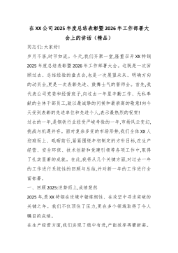 在XX公司2025年度总结表彰暨2026年工作部署大会上的讲话(精品)同志们:大家好!岁月不居,时节如流。今天,我们齐聚一堂,隆重召开XX特钢2025年度总结表彰暨2026年工作部署大会。这既是一次回顾过去、总结经验的盘点会,也是一次展望未来、明确方向的动员会,更是一次表彰先进、鼓舞士气的誓师会。首先,我代表公司党委和经营班子,向过去一年里辛勤工作、无私奉献的全体干部员工,致以最诚挚的问候和最崇高的敬意!向今天受到表彰的先进单位和先进个人,表示最热烈的祝贺!过去的一年,是钢铁行业经受严峻考验的一年,市场风云变幻,挑战与机遇并存。面对复杂多变的市场形势,我们全体XX人迎难而上、砥砺前行,紧紧围绕年初制定的方针目标,在生产经营、安全环保、技术创新和党建引领等各项工作中,取得了扎实显著的成就。在此...