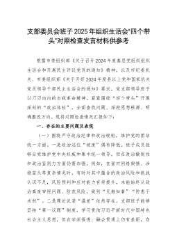 支部委员会班子2025年组织生活会“四个带头”对照检查发言材料供参考根据市委组织部《关于召开2024年度基层党组织组织生活会和开展民主评议党员的通知》精神,以及市纪委机关、市委组织部《关于开好2024年度县以上党和国家机关党员领导干部民主生活会的通知》要求,党支部领导班子以刀刃向内的自我革命精神,紧紧围绕“四个带头”开展深刻的“政治体检”,全面查找问题、深挖思想根源、明确整改方向。现将对照检查情况汇报如下:一、存在的主要问题及表现(一)围绕严守政治纪律和政治规矩,维护党的团结统一方面。一是政治站位“坡度”偶有降低。班子成员能够自觉维护党中央权威和集中统一领导,但在政治敏锐性和政治鉴别力方面仍需...