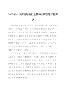 2022年ꎼ市交通运输行业精神文明创建工作要点2022年是全面实施“十四五”规划的重要一年,是贯彻落实省第十一次党代会和市第十二次党代会部署要求的开局之年,也是党的二十大召开之年,做好今年精神文明建设工作具有特殊重要意义。2022年全市交通运输系统精神文明建设工作总体要求是:以习近平新时代中国特色社会主义思想为指导,深入贯彻落实党的十九大和十九届历次全会精神以及习近平总书记关于社会主义精神文明建设的重要论述,牢记”两个确立”,增强”四个意识”、坚定“四个自信”、做到”两个维护”,自觉运用党的百年奋斗历史经验,弘扬伟大建党精神,以迎接、宣传、贯彻党的二十大为主线,紧紧围绕举旗帜、聚民心、育新人、...