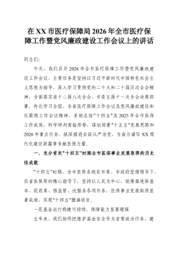 在XX市医疗保障局2026年全市医疗保障工作暨党风廉政建设工作会议上的讲话同志们:今天,我们召开2026年全市医疗保障工作暨党风廉政建设工作会议,主要任务是坚持以习近平新时代中国特色社会主义思想为指导,深入学习贯彻党的二十大和二十届历次全会精神,全面落实省十二届八次全会、市委五届十一次全会决策部署,传达学习全国、全省医疗保障工作会议及党风廉政建设和反腐败工作会议精神,系统总结"十四五"及2025年全市医保工作成效,科学研判面临形势,谋划部署"十五五"发展思路和2026年重点任务,纵深推进全面从严治党,为奋力谱写XX现代化建设新篇章贡献医保力量。一、充分肯定"十四五"时期全市医保事业发展取得的历史性成就"十四五"时期,全市医保系统在市委、市政府坚强领导下,在省医保局的精心指导下,坚持以人民为中...