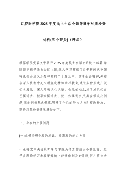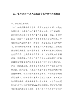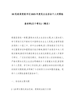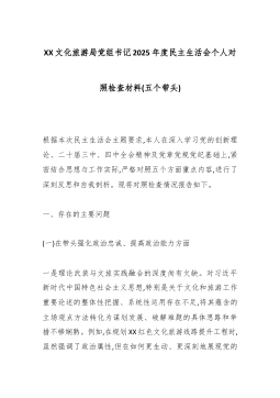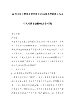 XX工业园区管委会党工委书记2025年度组织生活会个人对照检查材料(五个对照)各位同志:大家好。根据本次组织生活会的要求,会前,我深入学习了党的二十大和二十届四中全会精神,重温了《中国共产党章程》等党内法规,并与支部部分党员同志开展了深入的谈心谈话,广泛听取了意见建议。在此基础上,我紧扣党员身份本色、岗位履职实效、作风建设细节,深入查摆了自身存在的问题,剖析了问题根源,明确了整改方向。下面,我将个人对照检查情况汇报如下,请各位同志批评指正。一、存在的问题(一)在贯彻党的创新理论方面,存在学用脱节日现象一是理论学习存在“温差”。作为一名党员干部,虽然能够按时参加集体学习,但在个人自学上投入的精力还不够,主动性、计划性和系统性有待加强。对党的创新理论,特别是习近平新时代中国特色社会主义思想的最新...