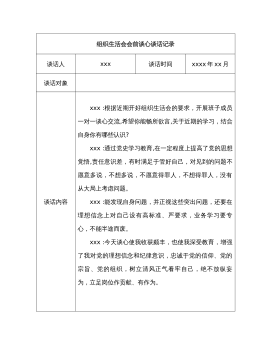 组织生活会会前谈心谈话记录谈话人xxx谈话时间xxxx年xx月谈话对象谈话内容xxx:根据近期开好组织生活会的要求,开展班子成员一对一谈心交流,希望你能畅所欲言,关于近期的学习,结合自身你有哪些认识?xxx:通过党史学习教育,在一定程度上提高了党的思想觉悟,责任意识差,有时满足于管好自己,对见到的问题不愿意多说,不想多说,不愿意得罪人,不想得罪人,没有从大局上考虑问题。xxx:能发现自身问题,并正视这些突出问题,还要在理想信念上对自己设有高标准、严要求,业务学习要专心,不能半途而废。xxx:今天谈心使我收获颇丰,也使我深受教育,增强了我对党的理想信念和纪律意识,忠诚于党的信仰、党的宗旨、党的组...