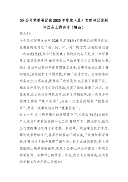 XX公司党委书记在2025年度党(总)支部书记述职评议会上的讲话(精品)同志们:今天我们召开X公司2025年度党(总)支部书记述职评议会,主要目的是通过“述、问、评、测”的方式,全面检验过去一年各党(总)支部书记抓党建工作的成效与不足,进一步压紧压实基层党建责任,确保全面从严治党要求在公司落地生根。刚才,各位书记紧扣年度党建重点任务,实事求是地汇报了履职情况,坦诚剖析了问题短板,明确了改进方向。大家的述职准备充分,内容实在,既展示了成绩亮点,也反映了差距不足。相互点评环节,同志们开门见山,交流了经验,凝聚了共识。总体来看,这次会议开得很成功,达到了预期效果,是一次对全年党建工作的“集中检阅”,也是一次直面问题的“把脉会诊”,更是一次激发动力的“重整行装”。过去一年,在上级党组织的坚强领导下,...