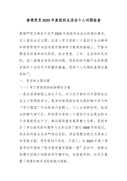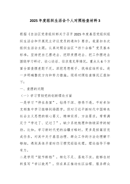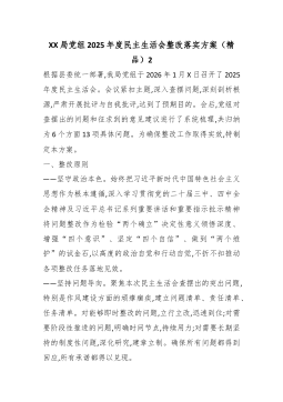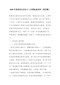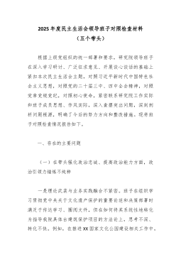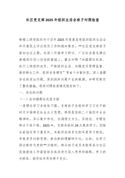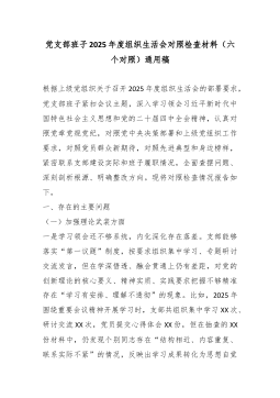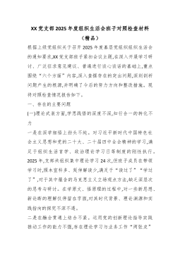 XX党支部2025年度组织生活会班子对照检查材料(精品)根据上级党组织关于召开2025年度基层党组织组织生活会的通知要求,XX党支部班子紧扣会议主题,在深入开展学习研讨、广泛征求意见建议、普遍进行谈心谈话的基础上,重点围绕“六个方面”内容,深入查摆存在的突出问题,深刻剖析问题产生的根源,并明确了今后的努力方向和整改措施。现将对照检查情况报告如下。一、存在的主要问题(一)理论武装方面,学思践悟的深度不深,知行合一的转化不力一是在深学细悟上劲头不纯。对习近平新时代中国特色社会主义思想和党的二十大、二十届四中全会精神的学习,满足于组织生活首学、政治理论学习日等制度的刚性执行。2025年,支部共组织集中理论学习24次,但班子成员在带领学习时,照本宣科多、延伸解读少,满足于“读过了”“学过了”,对于其...