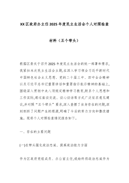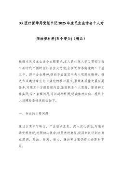 XX医疗保障局党组书记2025年度民主生活会个人对照检查材料(五个带头)(精品)根据本次民主生活会主题要求,本人紧扣深入学习贯彻习近平新时代中国特色社会主义思想,全面贯彻落实党的二十届三中、四中全会精神,锲而不舍落实中央八项规定精神、推进作风建设常态化长效化的核心要义,聚焦高质量发展首要任务,对照五个方面检视内容,紧密联系个人思想、职责和工作实际,深入查摆问题,深刻剖析根源,明确整改方向。现将个人对照检查情况报告如下。一、存在的主要问题通过认真学习研讨、广泛征求意见、深入谈心谈话,对照党章党规党纪,对照初心使命,对照先进典型,我深刻认识到自身在思想、政治、作风、能力、廉洁等方面仍存在差距和不足。(一)在带头强化政治忠诚、提高政治能力方面一是理论武装“深度”与“效度”尚有温差。虽然能够坚持参加...