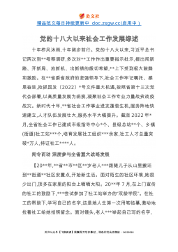 精品范文每日持续更新中doc.zsgw.cc(启用中)党的十八大以来社会工作发展综述十年栉风沐雨,十年阔步前行。党的十八大以来,习近平总书记两次到**考察调研,多次对**工作作出重要指示批示,提出闯新路、开新局、抢新机、出新绩的殷切希望,**上下受到极大鼓舞和激励。在**省委省政府的坚强领导下,社会工作牢记嘱托、感恩奋进,抢抓国发〔2022〕*号文件重大机遇,按照省第十三次党代会部署,以高质量发展为统揽,凝聚社会工作专业力量战贫战疫战灾。新时代十年,**省社会工作事业迸发蓬勃生机,服务阵地快速建立,人才队伍发展壮大,服务水平大幅提升。截至2022年*月,全省社会工作已建成市级指导中心*个、县级...