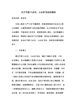 关于开展“六必访、七必谈”活动的通知各党支部、各单位:为深入推进“三严三实”专题教育,积极培育和践行社会主义核心价值观,认真贯彻落实“决战决胜四季度、全力实现安全年”动员大会精神,不断改进工作作风,紧密联系职工群众,及时掌握职工思想动态,帮助职工解决生产生活困难,促进企业和谐稳定。经矿党委研究,在全矿开展“六必访、七必谈”活动,现将有关事项通知如下:一、目的意义通过开展“六必访、七必谈”活动,随时了解职工思想、工作、生活情况,充分掌握职工思想行为动态,了解掌握职工在想什么,最需要解决什么问题,及时化解职工中出现的各种矛盾。对职工存在的苗头性问题、倾向性问题、普遍性问题,做到早发现、早提醒、早纠...