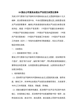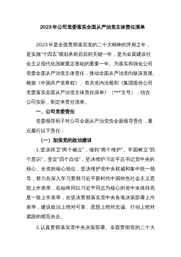2023年公司党委落实全面从严治党主体责任清单2023年是全面贯彻落实党的二十大精神的开局之年,是实施“十四五”规划承前启后的关键一年,是为全面建设社会主义现代化国家奠定基础的重要一年。为落实和强化公司党委全面从严治党主体责任,推动全面从严治党向纵深发展,根据《中国共产党章程》、有关党内法规和《集团股份公司党委落实全面从严治党主体责任清单》(***文号),结合公司实际,制定本责任清单。一、公司党委责任党委领导班子对公司全面从严治党负全面领导责任,重点履行以下责任:(一)加强党的政治建设1.坚决捍卫“两个确立”,做到“两个维护”。牢固树立“四个意识”,坚定“四个自信”,坚决维护习近平总书记党中央...