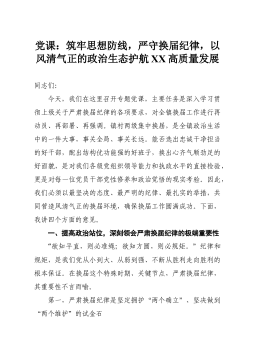讲纪律守规矩,扣好履职“第一粒扣子”——在全区新一届村(社区)“两委”干部履职培训班上的党课讲稿各位村(社区)“两委”干部同志们:大家好!今天,在全区新一届村(社区)“两委”干部履职培训班上,按照区委的统一部署和培训班的课程安排,由我来给大家上一堂纪律党课。首先,我代表区委、区纪委监委,向各位光荣当选为新一届村(社区)“两委”干部表示热烈的祝贺!同时,也要借此机会,提醒大家在新的岗位上,要始终把“讲纪律守规矩”摆在首位,扣好履职的“第一粒扣子”。同志们,村(社区)“两委”干部是党的路线方针政策在基层落地生根的直接执行者,是党和政府联系服务群众的“最后一公里”桥梁纽带。大家手中的权力虽然不大,但行使的是国家公权,服务的是父老乡亲,一言一行都代表着党的形象,一举一动都关系到群众的切身利益。今天,...