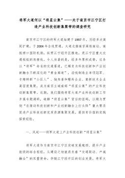 将军大道何以“将星云集”——关于南京市江宁区打造产业科技创新集聚带的调查研究 南京市江宁区的将军大道始建于1997年,历经多次南延扩建,于2004年全线贯通。大道北接南京高铁南站、南抵禄口国际机场,纵贯江宁经开区腹地,是江宁区重大交通枢纽的连接线。令人欣喜的是,经多年厚积成势,这条以“将军”命名的交通要道,已蝶变为科技创新和产业创新融合不断深化的“黄金廊道”,沿线制造业单项冠军、专精特新“小巨人”、独角兽和瞪羚企业、高新技术企业高密度集聚,成为南京主城南部“将星云集”的产业科技创新集聚带。近期,我们围绕将军大道产业科技创新工作开展专题调研,破解“将星云集”背后的密码,以期为贯彻“在推动科技创新和产业创新融合上打头阵”重大要求促进产业科技创新优质资源集聚发展,提供有价值的实践探索经验。 一...