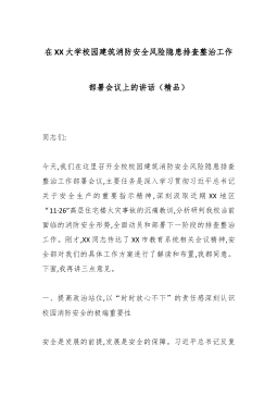 在XX大学校园建筑消防安全风险隐患排查整治工作部署会议上的讲话(精品)同志们:今天,我们在这里召开全校校园建筑消防安全风险隐患排查整治工作部署会议,主要任务是深入学习贯彻习近平总书记关于安全生产的重要指示精神,深刻汲取近期XX地区“11·26”高层住宅楼火灾事故的沉痛教训,分析研判我校当前面临的消防安全形势,全面动员和部署下一阶段的排查整治工作。刚才,XX同志传达了XX市教育系统相关会议精神,安全部对我们的具体工作方案进行了解读和布置,我都同意。下面,我再讲三点意见。一、提高政治站位,以“时时放心不下”的责任感深刻认识校园消防安全的极端重要性安全是发展的前提,发展是安全的保障。习近平总书记反复强调,人民至上、生命至上,要坚持统筹发展和安全。对于我们高校而言,安全稳定是一切事业发展的基础和生命...