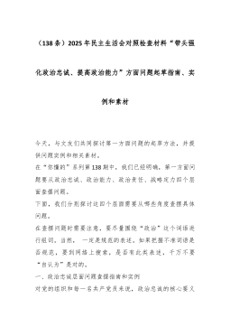 (138条)2025年民主生活会对照检查材料“带头强化政治忠诚、提高政治能力”方面问题起草指南、实例和素材今天,与文友们共同探讨第一方面问题的起草方法,并提供问题实例和相关素材。在“你懂的”系列第138期中,我们已经明确,第一方面问题要从政治忠诚、政治能力、政治责任、战略定力四个层面查摆问题。下面,我们分别探讨这四个层面需要从哪些角度查摆具体问题。在查摆问题时需要注意,要尽量围绕“政治”这个词语进行组词。当然,一定是规范的表述。如果把握不准词语是否规范,要到网络上搜索,是否有此类表述,千万不要“自认为”是对的。一、政治忠诚层面问题查摆指南和实例对党的组织和每一名共产党员来说,政治忠诚的核心要义就是对党忠诚。对党忠诚,既是党员庄严的政治责任、严格的政治要求,也是必须自觉遵守的政治道德规范。因此...