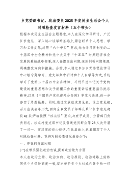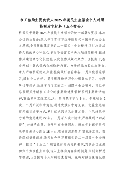 市工信局主要负责人2025年度民主生活会个人对照检视发言材料(五个带头)根据关于开好2025年度民主生活会的统一部署和要求,本次会议的主题是:深入学习贯彻习近平新时代中国特色社会主义思想,全面贯彻落实党的二十届四中全会精神,以打攻坚战、持久战的决心和恒心,锲而不舍落实中央八项规定精神,推进作风建设常态化长效化,以优良作风凝心聚力、真抓实干,奋力开创中国式现代化建设新局面。为开好此次民主生活会,本人严格按照规定步骤,扎实做好会前准备:一是深化理论学习,通过个人自学、局党组理论学习中心组集体学习、专题研讨等形式,系统学习了党的二十届四中全会精神、习近平总书记关于新型工业化的重要论述及最新系列重要讲话精神,重温党章党规党纪,累计参与集中学习5次、专题研讨2次。二是广泛征求意见,通过发放征求意见表、...