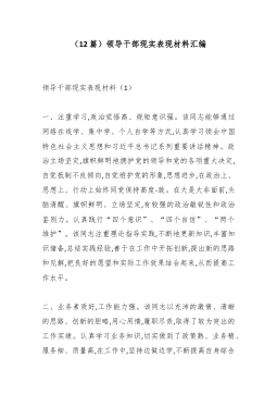 (12篇)领导干部现实表现材料汇编领导干部现实表现材料(1)一、注重学习,政治觉悟高、规矩意识强。该同志能够通过网络在线学、集中学、个人自学等方式,认真学习领会中国特色社会主义思想和习近平总书记系列重要讲话精神。政治立场坚定,旗帜鲜明地拥护党的领导和党的各项重大决定,自觉抵制不良倾向,自觉维护党的形象,思想进步,在政治上、思想上、行动上始终同党保持高度-致。在大是大非面前,头脑清醒、旗帜鲜明、立场坚定,有较强的政治敏锐性和政治鉴别力。认真践行“四个意识”、“四个自信”、“两个维护”。该同志注重理论指导实践,不断地更新知识,丰富知识储备,总结实践经验,善于在工作中开拓创新,提出新的思路和见解,把良好的愿望和实际工作效果结合起来,从而提高工作水平。二、业务素质好,工作能力强。该同志以充沛的激情、...