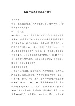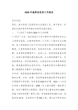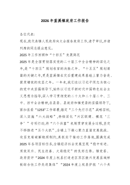 2026年蓝溪镇政府工作报告各位代表:现在,我代表镇人民政府向大会报告政府工作,请予审议,并请列席的同志提出意见。2025年工作回顾和“十四五”发展简况2025年是全面贯彻落实党的二十届三中全会精神的深化之年,是“十四五”规划收官的决胜之年、“十五五”规划谋篇的关键之年,更是蓝溪镇在灾后重建成果基础上蓄力奋进、提质增效的攻坚之年。一年来,我们在以习近平同志为核心的党中央坚强领导下,始终以习近平新时代中国特色社会主义思想为指导,深入学习贯彻党的二十大和二十届二中、三中、四中全会精神,在县委、县政府和镇党委的坚强领导下,紧扣县委“1253”工作部署,锚定“三个先行示范”战略目标,深入实施“六大战略”,持续深化“片区联建、模范‘三争’”专项行动,将“六个共富”机制贯穿发展全过程,坚定不移推进“五个...