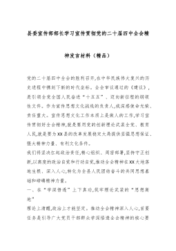 县委宣传部部长学习宣传贯彻党的二十届四中全会精神发言材料(精品)党的二十届四中全会的胜利召开,在中华民族伟大复兴的历史进程中镌刻下新的时代坐标。全会审议通过的《建议》,是引领全党全国人民奋进“十五五”、迈向新征程的纲领性文件。作为宣传思想文化战线的负责人,我深感使命光荣、责任重大。宣传思想文化工作本质上是做人的工作,学习宣传贯彻好全会精神,就是要用党的创新理论武装全党、教育人民,就是要为XX县的改革发展稳定大局提供坚强思想保证、强大精神力量、有利文化条件。我们将坚决扛起政治责任,精心组织、周密部署,坚持守正创新,以高度的政治自觉和行动自觉,推动全会精神在XX大地落地生根、深入人心,转化为全县人民团结奋斗的共同思想基础和磅礴精神力量。一、在“学深悟透”上下真功,筑牢理论武装的“思想高地”理论上...