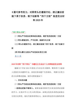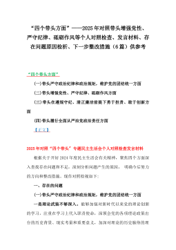 2025年带头严守政治纪律和政治规矩,维护党的团结统一方面等“四个带头”检查材料存在的问题检查材料及进一步努力方向、改进措施【5篇】供参考县委书记2025年生活会“四个带头”对照检查材料重点查摆4个方面问题:(1)带头严守政治纪律和政治规矩,维护党的团结统一方面;(2)带头增强党性、严守纪律、砥砺作风方面;(3)带头在遵规守纪、清正廉洁前提下勇于担责、敢于创新方面;(4)带头履行全面从严治党政治责任方面。【正文】尊敬的各位领导、同志们:大家好!在这次生活会上,我围绕“四个带头”的要求,认真进行了自我检查和反思。下面,我将对照检查情况向大家作以汇报,请予审议。一、带头学习贯彻党的创新理论,始终做...