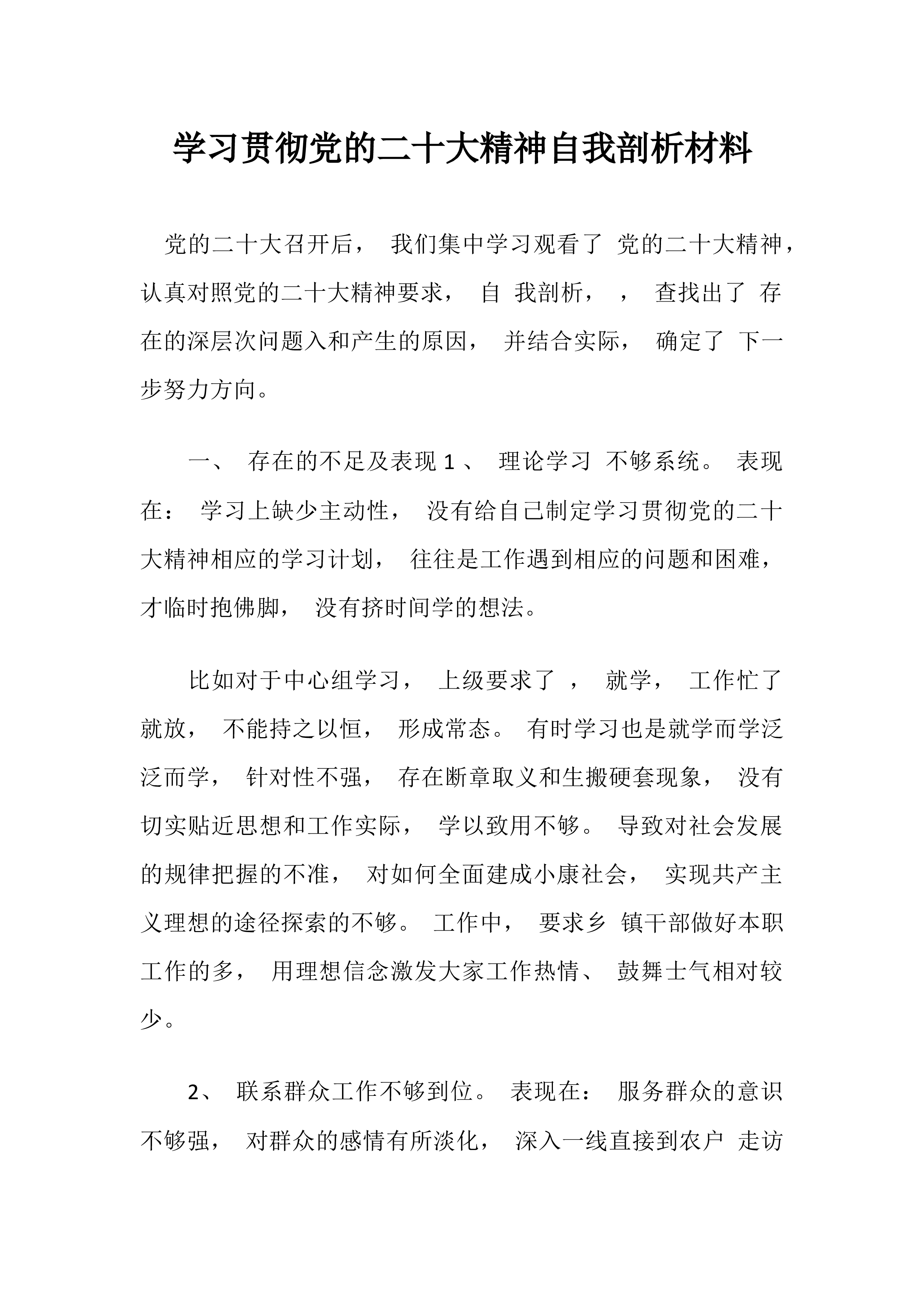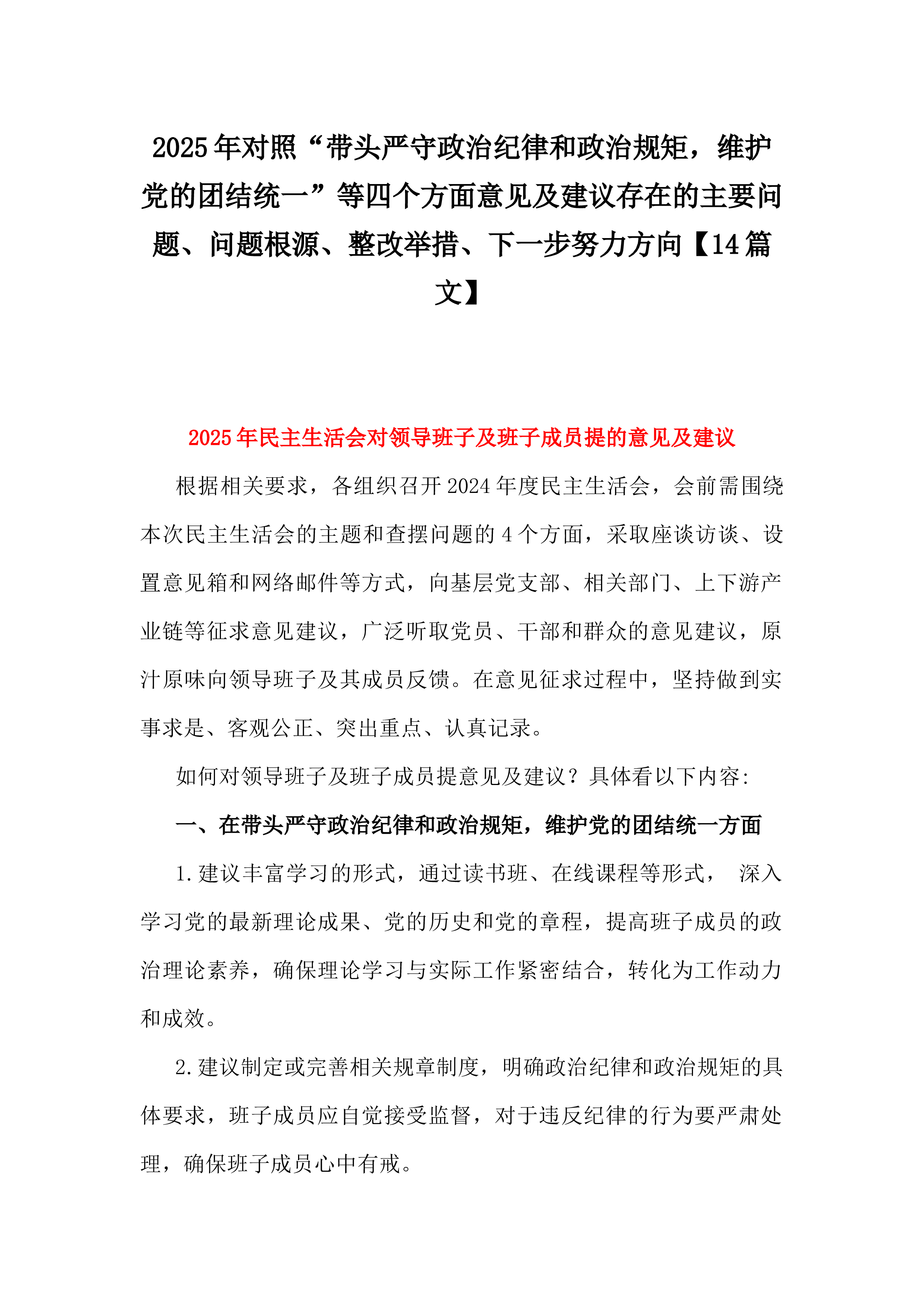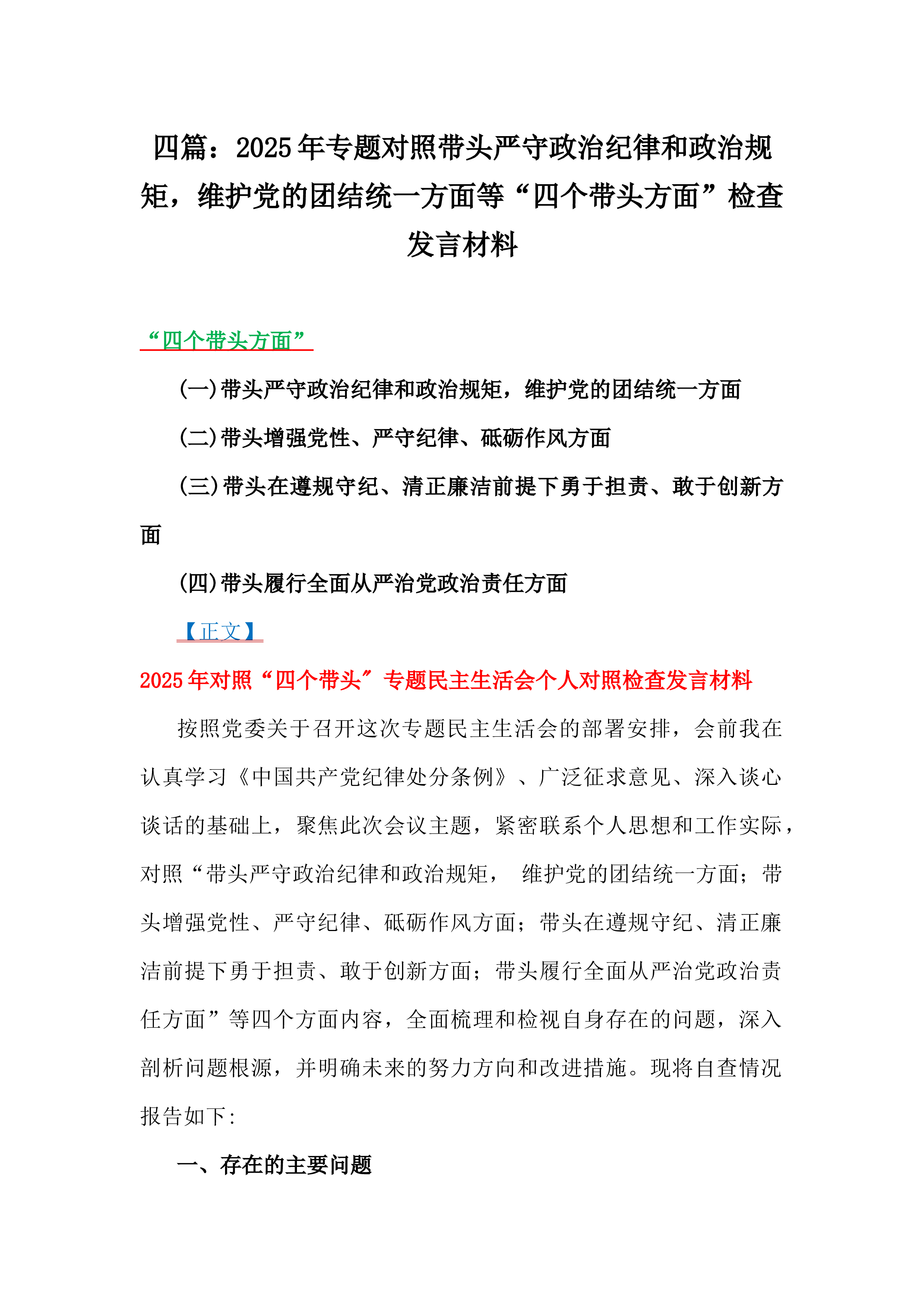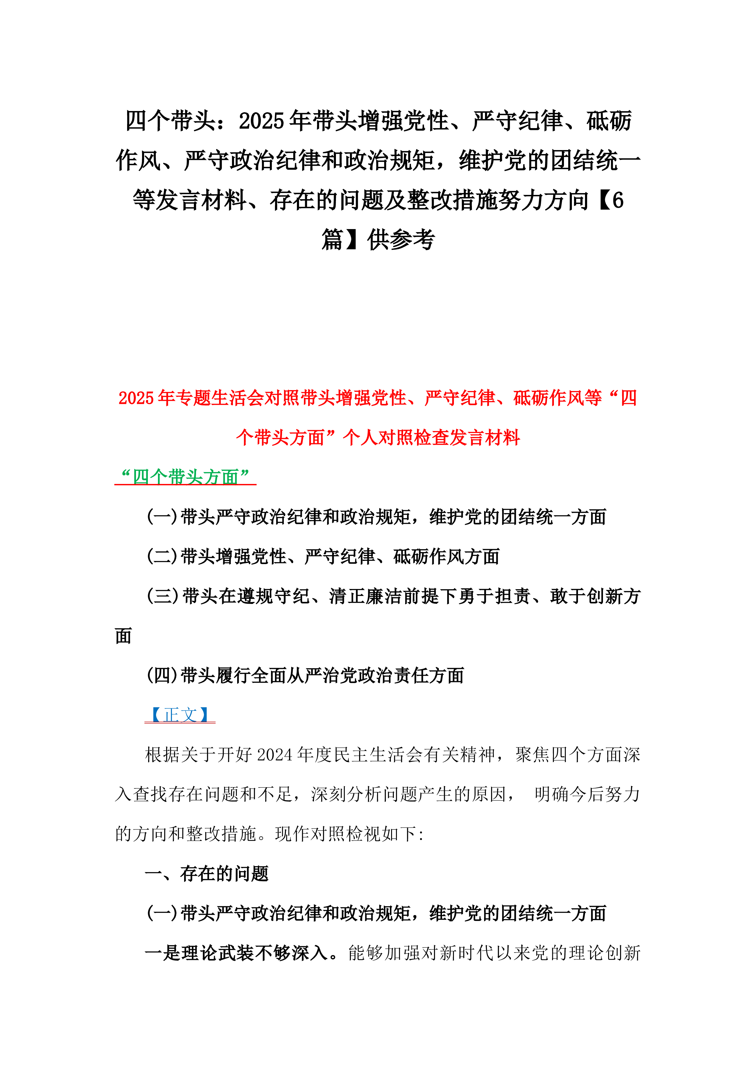 2025年班子成员民主生活会个人对照检查剖析材料根据《关于做好2024年度民主生活会有关工作的通知》要求,我深入学习贯彻习近平新时代中国特色社会主义思想,认真领悟习近平总书记关于党的建设的重要思想,仔细学习了《党章》《关于新形势下党内政治生活的若干准则》《中国共产党党内监督条例》《中国共产党纪律处分条例》和党中央关于民主生活会的有关要求。通过学习,我个人的思想认识进一步提高,政治觉悟、党性修养进一步提升。随后,我紧紧围“”绕四个带头,“”坚持三个摆进去,通过班子成员之间,与县直属各部门负责人,以及与所在党支部部分党员开展谈心谈话,进行党性分析,深刻检视反思,剖析问题产生的原因,明确了整改措施和...