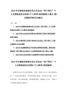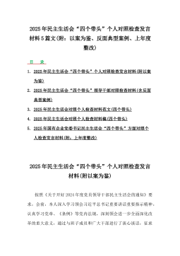 四个带头:2025年带头增强党性、严守纪律、砥砺作风、严守政治纪律和政治规矩,维护党的团结统一等四个带头方面主持词、发言材料、存在的问题及整改措施努力方向【12篇】供参考2025年民主生活会主持词范文稿同志们:按照县委组织部的统一部署,今天我们召开2024年度民主生活会。这次民主生活会的主题是:深入学习贯彻习近平新时代中国特色社会主义思想,巩固深化党纪学习教育成果,综合发挥党的纪律教育约束、保障激励作用,为进一步全面深化改革、推进中国式现代化提供坚强纪律保证。这次会议我们要重点把握几个方面:一是深入学习贯彻党的二十大和二十届二中、三中全会精神,深刻领会新时代新征程党的使命任务,准确把握党中央关...