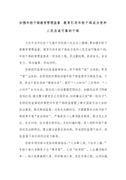 加强年轻干部教育管理监督教育引导年轻干部成为党和人民忠诚可靠的干部习近平总书记在十九届中央纪委六次全会上强调,要加强年轻干部教育管理监督,教育引导年轻干部成为党和人民忠诚可靠的干部。年轻干部的管理监督是一项系统工程,须注重统筹、抓好结合,多向发力、综合施策、形成闭环。坚持组织监管与纪检监督相结合。好干部是“选”出来的,更是“管”出来的。各级党组织要把加强年轻干部监管作为锻造忠诚、干净、担当干部队伍的“硬核任务”,紧盯“八小时内”工作用权、“八小时外”社交生活,通过谈心谈话掌握思想动态、加强纪法学习明晰底线红线、强化警示教育匡正价值导向,扣好廉洁从政“第一粒扣子”。各级纪检监察组织要把对年轻干部...