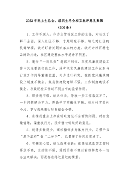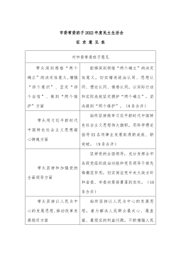 市委常委班子2022年度民主生活会征求意见表对市委常委班子意见带头深刻感悟“两个确立”的决定性意义,增强“四个意识”、坚定“四个自信”、做到“两个维护”方面能够深刻领悟“两个确立”的决定性意义,切实增进政治认同、思想认同、理论认同、情感认同,以实际行动和实际成效坚定拥护“两个确立”,坚决做到“两个维护”。(8条合并)带头用习近平新时代中国特色社会主义思想凝心铸魂方面始终坚持高举习近平新时代中国特色社会主义思想伟大旗帜,用科学理论指导XX各项事业发展取得新成效、新突破。(9条合并)带头坚持和加强党的全面领导方面坚持党的全面领导,充分发挥全市各级党组织政治功能和党员领导干部先锋模范作用,切实保证党...