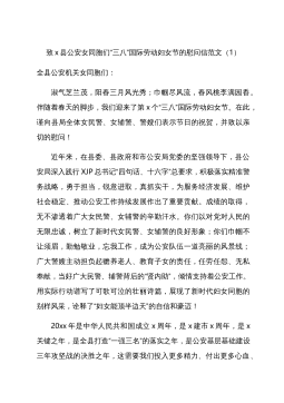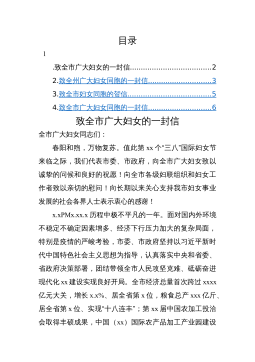 目录1.致全市广大妇女的一封信.....................................22.致全州广大妇女同胞的一封信.............................33.致全市妇女同胞的贺信......................................54.致全市广大妇女同胞的一封信.............................6致全市广大妇女的一封信全市广大妇女同志们:春阳和煦,万物复苏。值此第xx个“三八”国际妇女节来临之际,我们代表市委、市政府,向全市广大妇女致以诚挚的问候和良好的祝愿!向全市各级妇联组织和妇女工作者致以亲切的慰问!...