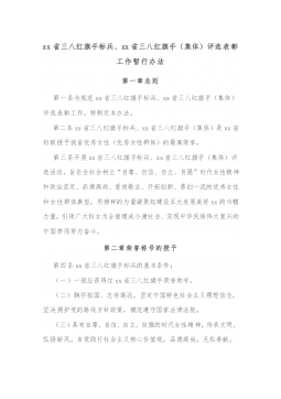 xx省三八红旗手标兵、xx省三八红旗手(集体)评选表彰工作暂行办法第一章总则第一条为规范xx省三八红旗手标兵、xx省三八红旗手(集体)评选表彰工作,特制定本办法。第二条xx省三八红旗手标兵、xx省三八红旗手(集体)是xx省妇联授予我省优秀女性(优秀女性群体)的最高荣誉。第三条开展xx省三八红旗手标兵、xx省三八红旗手(集体)评选活动,旨在全社会树立“自尊、自信、自立、自强”时代女性精神和政治坚定、品德高尚、爱岗敬业、开拓创新、勇创一流的优秀女性和女性群体典型,用榜样的力量凝聚起建设五大发展美好xx的巾帼力量,引领广大妇女为全面建成小康社会、实现中华民族伟大复兴的中国梦而努力奋斗。第二章荣誉称号...