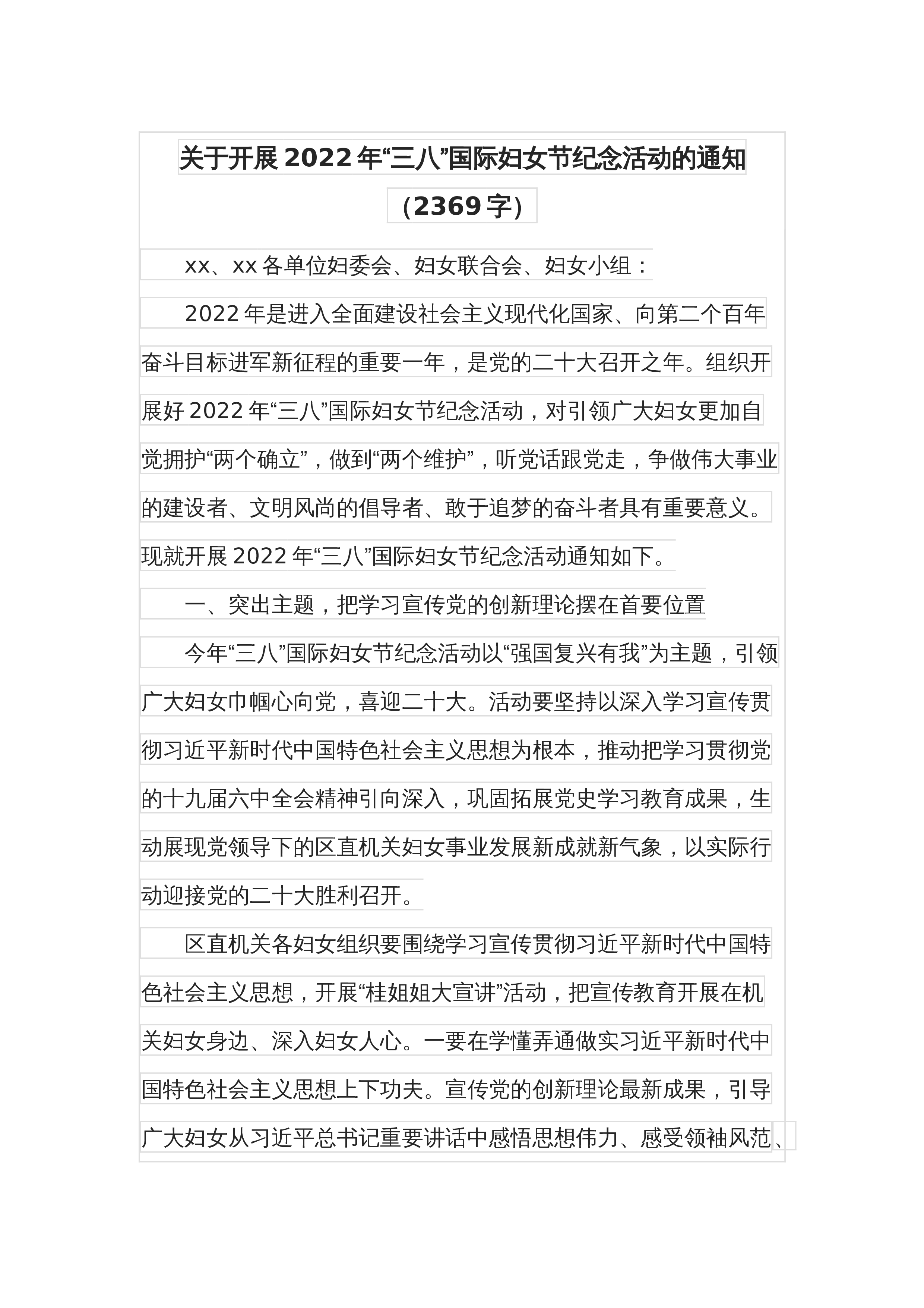关于开展2022年“三八”国际妇女节纪念活动的通知(2369字)