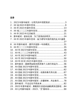 目录1.2023年新年献词:让明天的中国更美好.......................32.XX省2023年新年贺词..............................................93.XX市2023年新年贺词............................................134.XX省二〇二三年新年贺词........................................165.XX市2023年元旦献词............................................216.新年献词:使命在肩,为了更美...