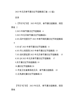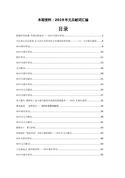 目录一、党政机关1.习近平:二〇二三年新年贺词12.全国人大:新年献词:将奋斗汇入时代长河43.钟华论:2023年新年献词:让明天的中国更美好74.贵州省:2023年贵州省新年贺词115.重庆市:2023年新年贺词146.山东省省长周乃翔:二〇二三年新年贺词167.上海市市长龚正:2023年元旦献词198.人民网海南频道:新年献词:使命在肩,为了更美好的明天219.成都市:2023年新年贺词:奋力谱写中国式现代化成都篇章2310.沈阳市:新年献词:携手共迎新一年的曙光2511.巴彦淖尔市:二〇二三年新年贺词2812.襄阳市:2023年新年贺词3113.乌海市:二〇二三年新年贺词3414.铁岭市...