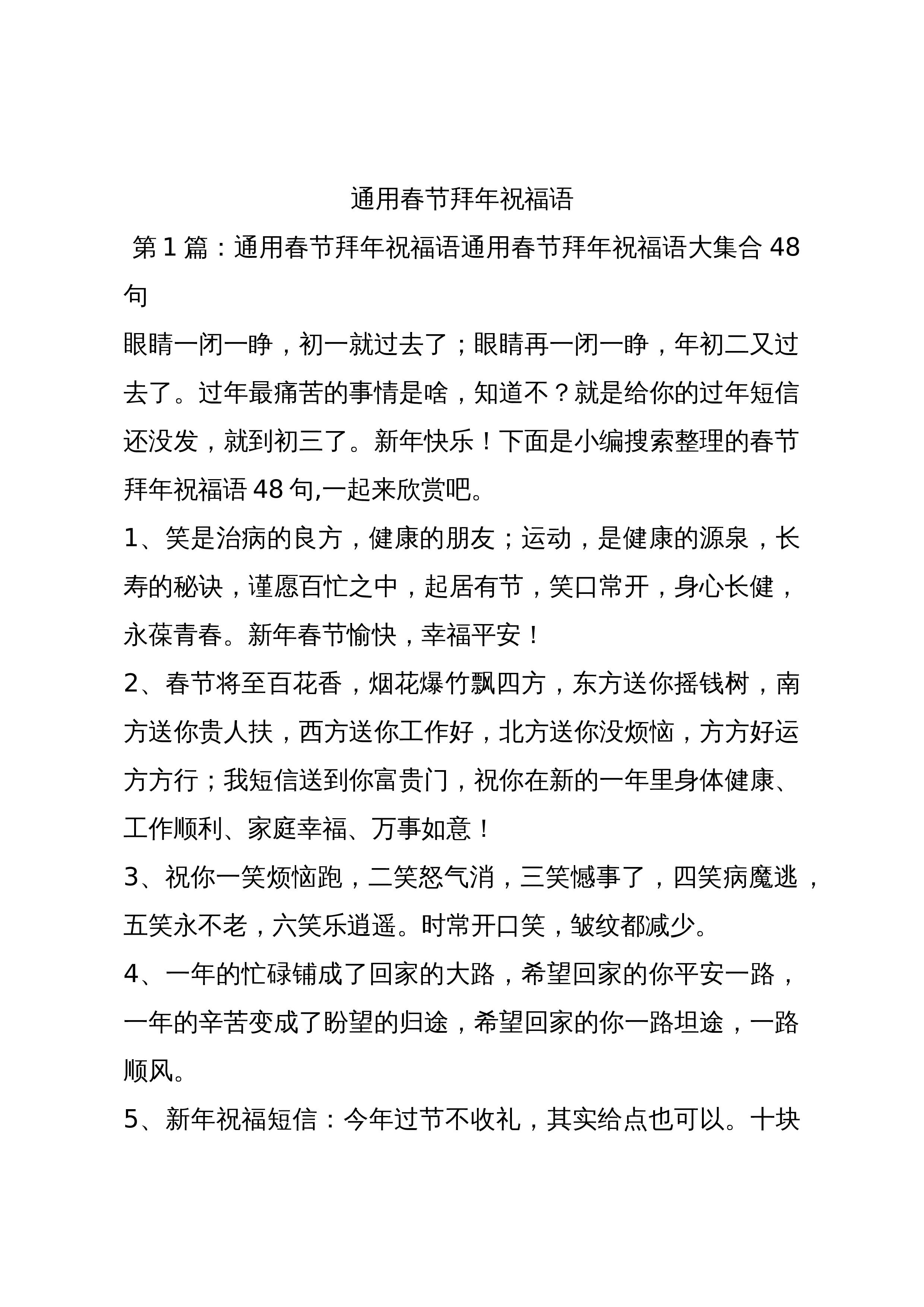 通用春节拜年祝福语第1篇:通用春节拜年祝福语通用春节拜年祝福语大集合48句眼睛一闭一睁,初一就过去了;眼睛再一闭一睁,年初二又过去了。过年最痛苦的事情是啥,知道不?就是给你的过年短信还没发,就到初三了。新年快乐!下面是小编搜索整理的春节拜年祝福语48句,一起来欣赏吧。1、笑是治病的良方,健康的朋友;运动,是健康的源泉,长寿的秘诀,谨愿百忙之中,起居有节,笑口常开,身心长健,永葆青春。新年春节愉快,幸福平安!2、春节将至百花香,烟花爆竹飘四方,东方送你摇钱树,南方送你贵人扶,西方送你工作好,北方送你没烦恼,方方好运方方行;我短信送到你富贵门,祝你在新的一年里身体健康、工作顺利、家庭幸福、万事如意...