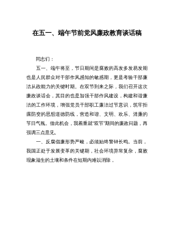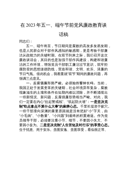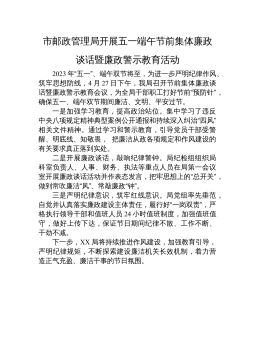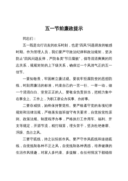 市自然资源局党组关于2023年“五一”、“端午”节假日期间正风肃纪工作的通知各旗区自然资源局、直属分局,各科室、直属事业单位:2023年“五一”、端午节将至,为深入贯彻落实党的贰拾DA精神,认真落实中央八项规定精神要求,坚决防止“四风”问题反弹回潮,进一步营造廉洁过节的良好氛围,现将有关纪律要求通知如下:一、提高政治站位,强化学习教育 各旗区自然资源局、各直属分局,各科室、直属事业单位要深入学习习近平总书记有关廉洁自律的重要讲话、重要指示精神,通过公开通报曝光的典型案例加强警示教育和廉政提醒,切实增强纪律意识,不断强化廉洁自律的思想意识和行动自觉,时刻自重自省自警自励、慎独慎微慎始慎终,做政治...