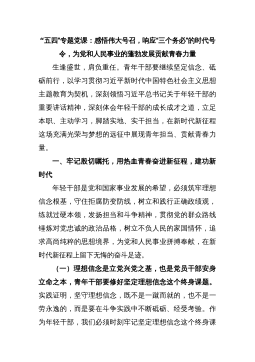 “五四”专题党课:感悟伟大号召,响应“三个务必”的时代号令,为党和人民事业的蓬勃发展贡献青春力量生逢盛世,肩负重任。青年干部要继续坚定信念、砥砺前行,以学习贯彻习近平新时代中国特色社会主义思想主题教育为契机,深刻领悟习近平总书记关于年轻干部的重要讲话精神,深刻体会年轻干部的成长成才之道,立足本职、主动学习,脚踏实地、实干担当,在新时代新征程这场充满光荣与梦想的远征中展现青年担当、贡献青春力量。一、牢记殷切嘱托,用热血青春奋进新征程,建功新时代年轻干部是党和国家事业发展的希望,必须筑牢理想信念根基,守住拒腐防变防线,树立和践行正确政绩观,练就过硬本领,发扬担当和斗争精神,贯彻党的群众路线锤炼对党...