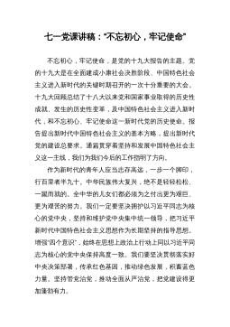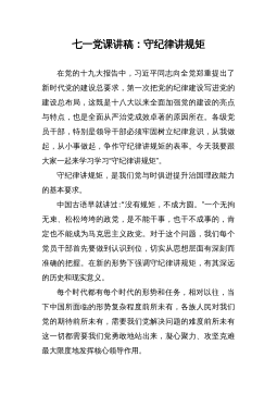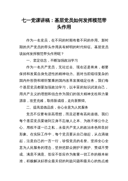 七一党课讲稿:争做新时代的合格党员(纲要)“我志愿加入中国共产党,拥护党的纲领,遵守党的章程,履行党员义务,执行党的决定,严守党的纪律,保守党的秘密,对党忠诚,积极工作,为共产主义奋斗终身,随时准备为党和人民牺牲一切,永不叛党。”——中国共产党入党誓词201x年是伟大的中国共产党成立x周年。从嘉兴南湖的红船到抗日战争的峥嵘岁月,从新中国成立到改革的春风吹拂的x周年,中国人民在中国共产党的领导下,走过了一条艰苦卓绝的奋斗历程。成立x年,中国共产党从一个不到60人的“地下党”,逐步发展壮大到拥有8900多万党员的世界最大执政党。党的地位变了、实力强了,但是对于每一名共产党员来说,做合格党员,却是永...