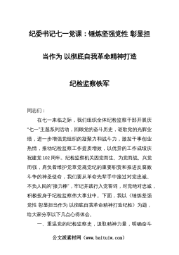 纪委书记七一党课:锤炼坚强党性彰显担当作为以彻底自我革命精神打造纪检监察铁军同志们: 在七一来临之际,我们组织全体纪检监察干部开展庆“七一”主题系列活动,回顾党的奋斗历史,讴歌党的光辉业绩,进一步增强党组织的凝聚力和战斗力,激发干事创业热情,推动纪检监察工作提质增效,以优异的工作成绩庆祝建党102周年。纪检监察机关因党而生、为党而战、兴党而强,肩负着维护党章党规党纪的重要职责和推进反腐败斗争的神圣使命,我们要从革命先辈手中接过对党忠诚、不负人民的“接力棒”,牢记并践行入党誓词,对党绝对忠诚,积极投身于纪检监察伟大事业中。下面,我以《锤炼坚强党性彰显担当作为以彻底自我革命精神打造纪检》为题,给...