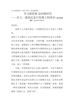本文系邮箱投稿,仅供学习参考,请勿照搬照抄!学习新思想迈向新时代——在七一建党纪念日党课上的讲话【更多免费素材,qq3565118301】同志们:党的十九大报告指出,中国特色社会主义进入了新时代。党的十九大提出了习近平新时代中国特色社会主义思想,并从历史发展、时代品格、主体归属、内容体系和指导价值上对这一思想进行了科学概括和准确定位,揭示了其思想内容和实践方略,为新时代中国特色社会主义建设和中华民族伟大复兴提供了思想指南和理论指导。2018年是学习贯彻落实党的十九大精神的开局之年。在党的生日的特殊日子里,我想围绕“学习新思想迈向新时代”主题,和大家一起上一堂党课。当前,中国特色社会主义进入新时...