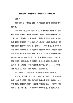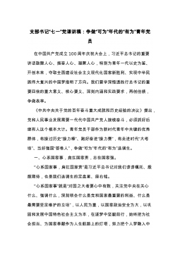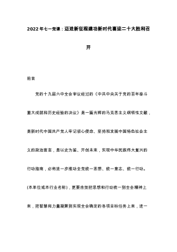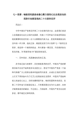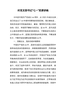 七一党课:锤炼党性践使命凝心聚力葆初心以自觉担当的实际行动喜迎党的二十大胜利召开同志们:今年中国共产党将召开第二十次全国代表大会,这是我们党进入全面建设社会主义现代化国家、向第二个百年奋斗目标进军新征程的重要时刻召开的一次十分重要的代表大会,是党和国家政治生活中的一件大事。值此之际,根据党支部工作计划和“七一”组织生活安排,借这样一个难得的机会,和大家做一番交流,与在座的各位党员共勉,为“美丽幸福XX”建设添砖加瓦。一、百年党史,风雨兼程恰风华正茂。岁月铭记奋斗的艰辛,历史映射真理的光芒。中国共产党的辉煌历程不仅在于始终坚持马克思主义,更在于中国共产党是一个始终代表最广大人民群众根本利益的伟大...