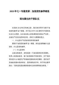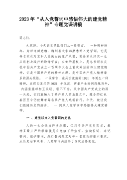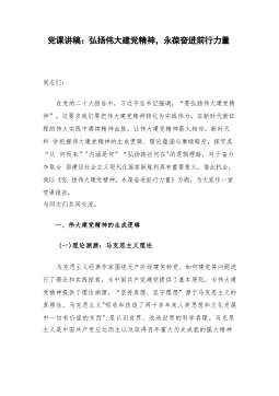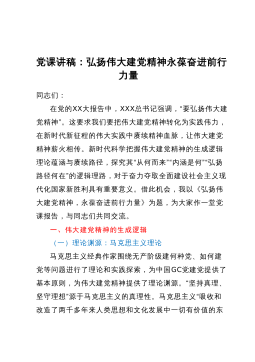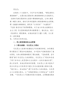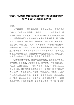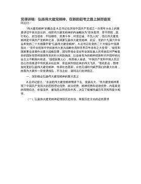 党课:弘扬伟大建党精神不断夺取全面建设社会主义现代化国家新胜利同志们:人无精神不立,国无精神不强,党无精神不兴。习近平总书记指出:“唯有精神上站得住、站得稳,一个民族才能在历史洪流中屹立不倒、挺立潮头。”在庆祝中国共产党成立***周年大会上,习近平总书记首次提出并深刻阐述伟大建党精神,即“坚持真理、坚守理想,践行初心、担当使命,不怕牺牲、英勇斗争,对党忠诚、不负人民"。党的二十大报告将“弘扬伟大建党精神”写进大会主题,并强调“弘扬以伟大建党精神为源头的中国共产党人精神谱系",表明了我们党以什么样的精神状态,全面建设社会主义现代化国家、全面推进中华民族伟大复兴。借此机会,由我为大家作一堂党课报告...