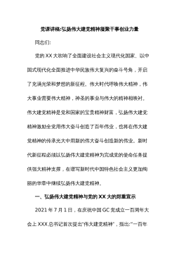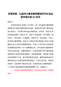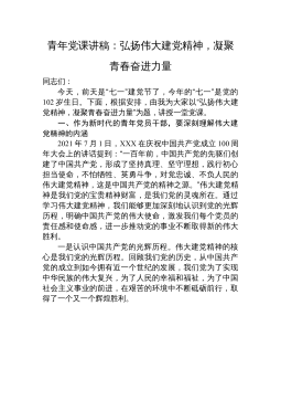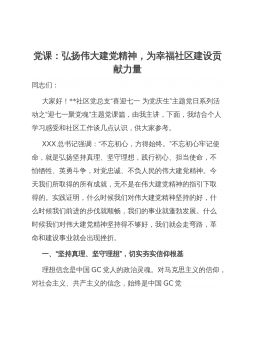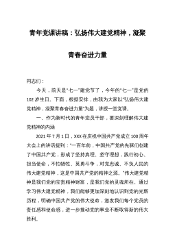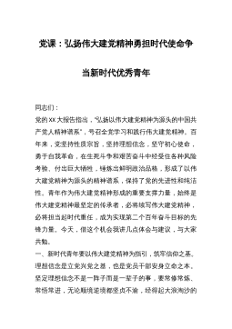 党课讲稿:弘扬伟大建党精神赓续百年红色血脉争做合格共产党员同志们:为庆祝中国共产党成立102周年,进一步弘扬伟大建党精神,增强党员干部政治素质和政治品格,激发党员干部干事创业的信心和决心。今天我们举办这次党课活动。百年前,中国共产党的先驱们创建了中国共产党,形成了“坚持真理、坚守理想,践行初心、担当使命,不怕牺牲、英勇斗争,对党忠诚、不负人民”的伟大建党精神。党的贰拾DA是在全党全国各族人民迈上全面建设社会主义现代化国家新征程、向第二个百年奋斗目标进军的关键时刻召开的一次十分重要的大会。把“弘扬伟大建党精神”写进大会的主题,是要郑重宣示,全党必须恪守伟大建党精神,保持党同人民群众的血肉联系,保...