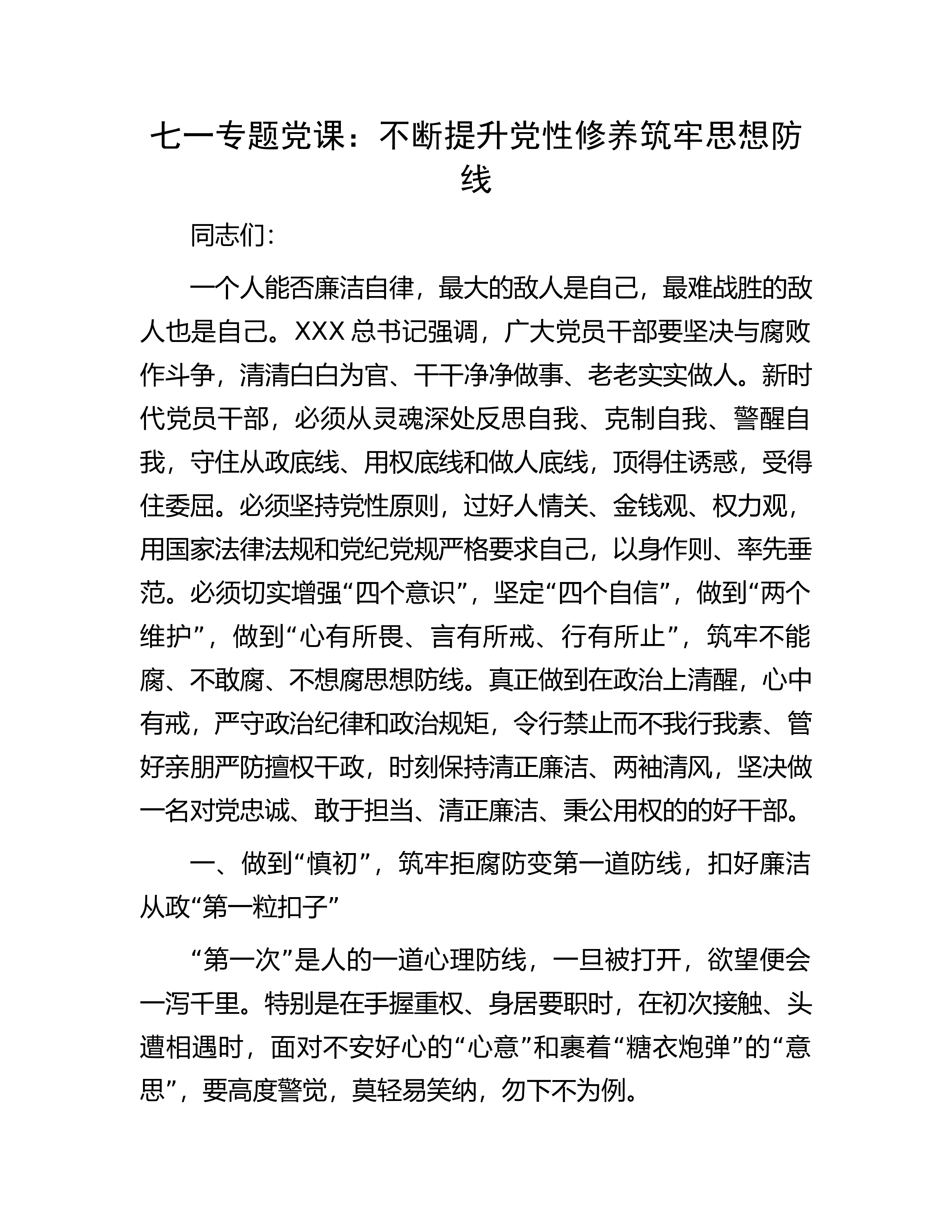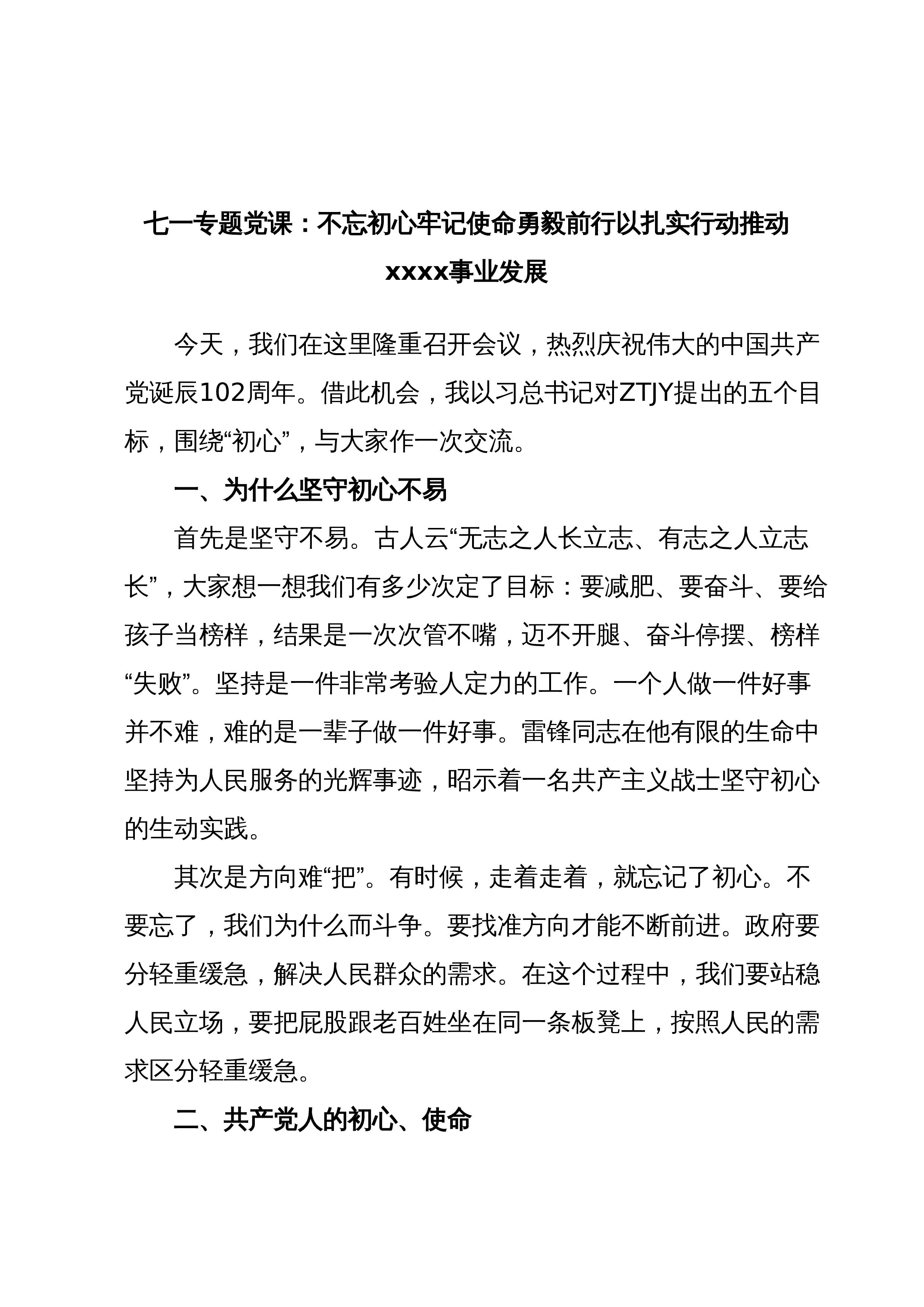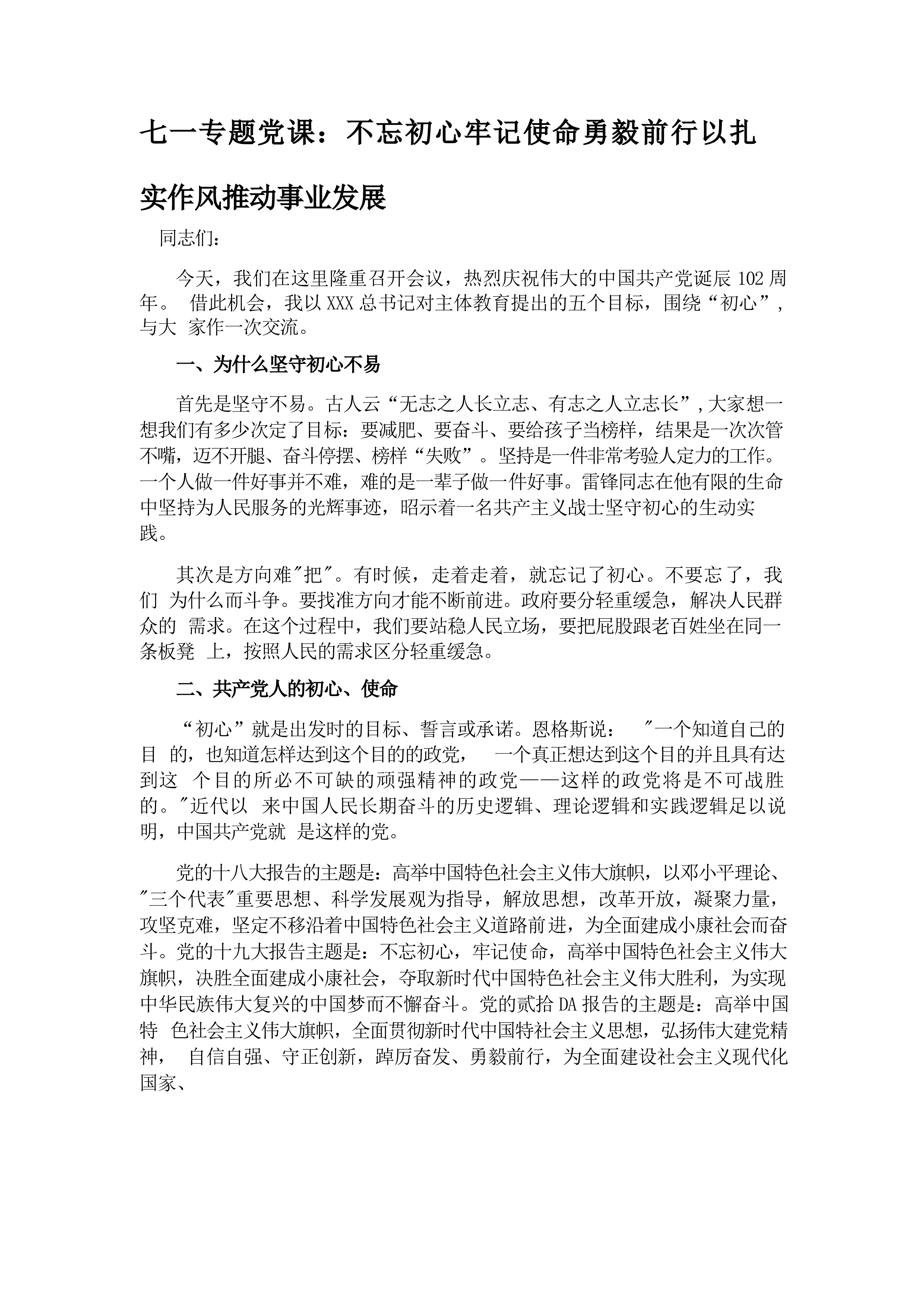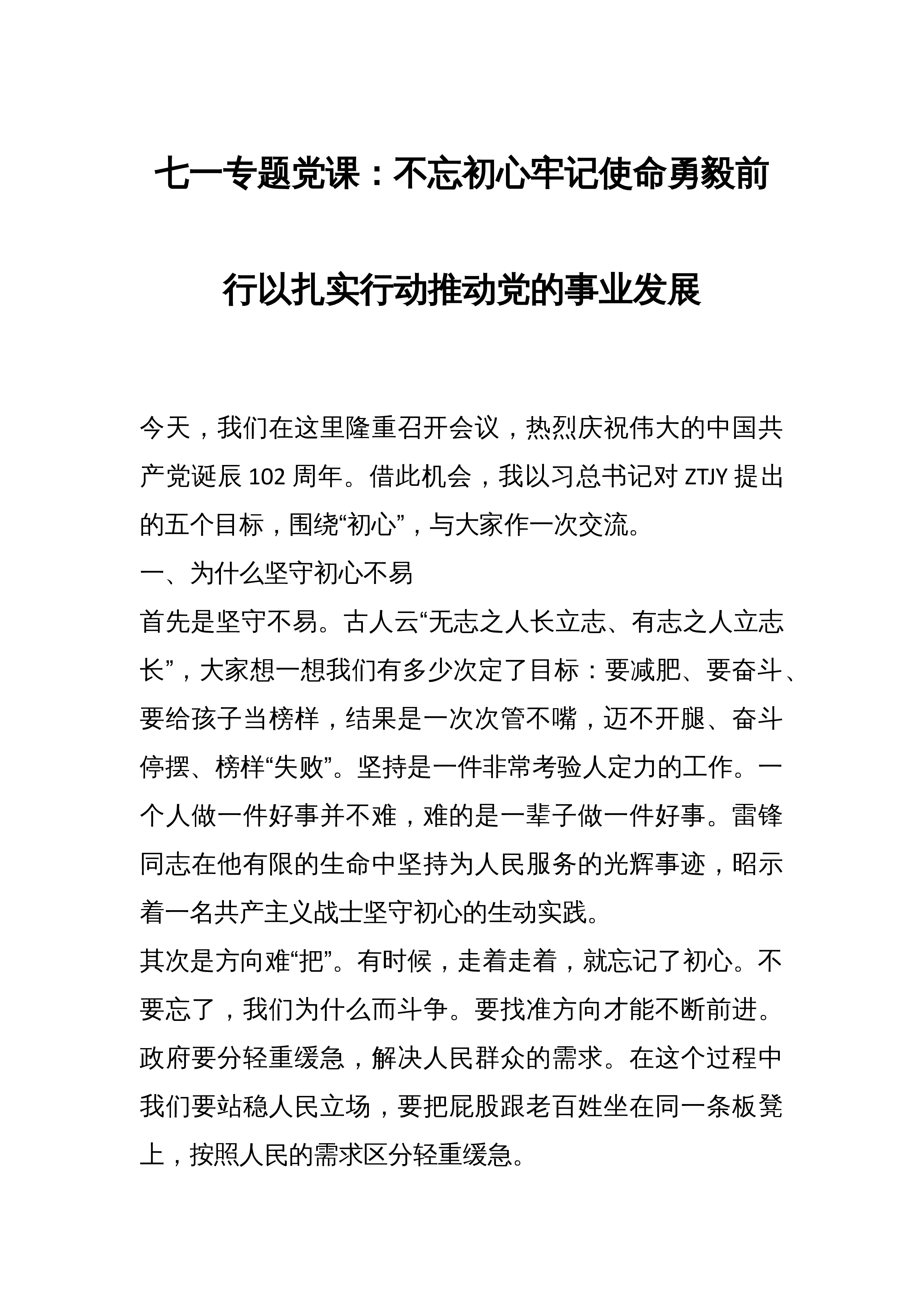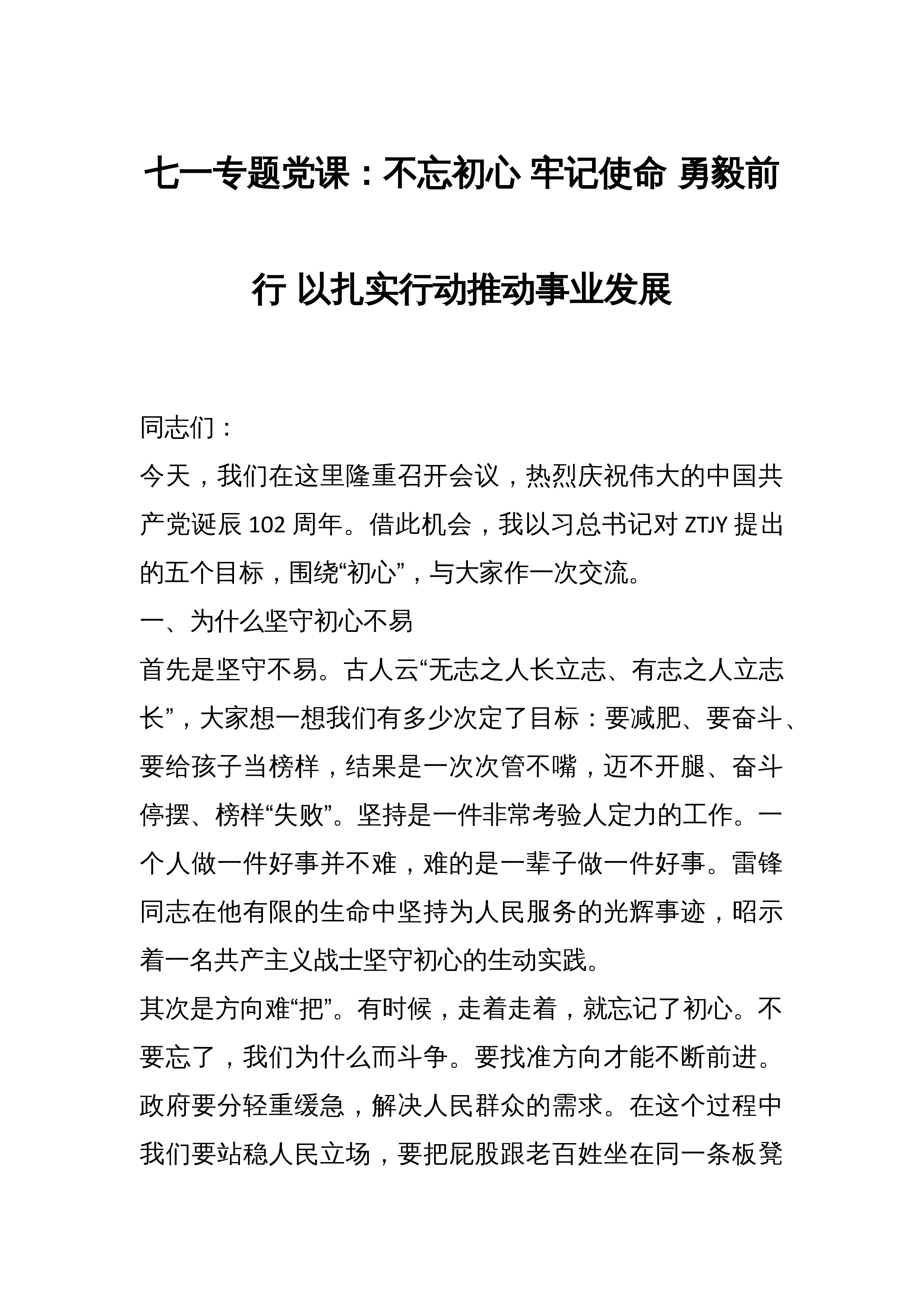 七一专题党课:不忘初心牢记使命勇毅前行以扎实作风推动事业发展同志们:今天,我们在这里隆重召开会议,热烈庆祝伟大的中国共产党诞辰102周年。借此机会,我以习近平总书记对主体教育提出的五个目标,围绕“初心”,与大家作一次交流。一、为什么坚守初心不易首先是坚守不易。古人云“无志之人长立志、有志之人立志长”,大家想一想我们有多少次定了目标:要减肥、要奋斗、要给孩子当榜样,结果是一次次管不嘴,迈不开腿、奋斗停摆、榜样“失败”。坚持是一件非常考验人定力的工作。一个人做一件好事并不难,难的是一辈子做一件好事。雷锋同志在他有限的生命中坚持为人民服务的光辉事迹,昭示着一名共产主义战士坚守初心的生动实践。其次是方...
